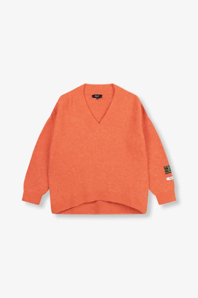 Trui gebreid van zachte, fantasierijke garens en heeft een v-hals.