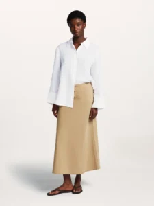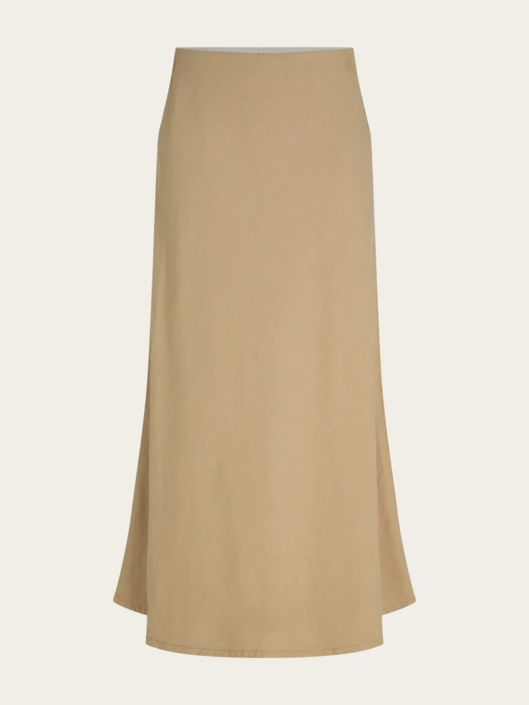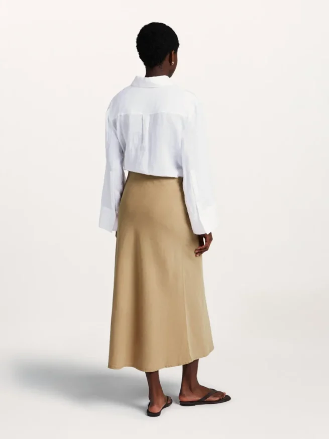 Deze rok in gewassen linnen-katoen heeft een lange lengte en een soepelvallende, diagonaal gesneden fit. De elastische tailleband met logo aan de binnenkant zorgt voor extra comfort.