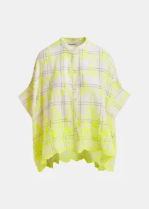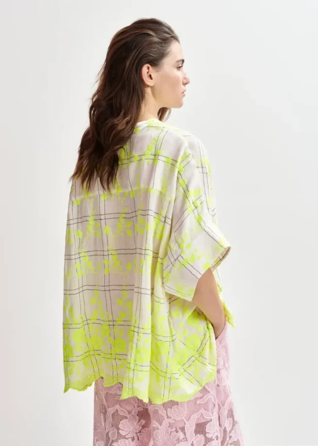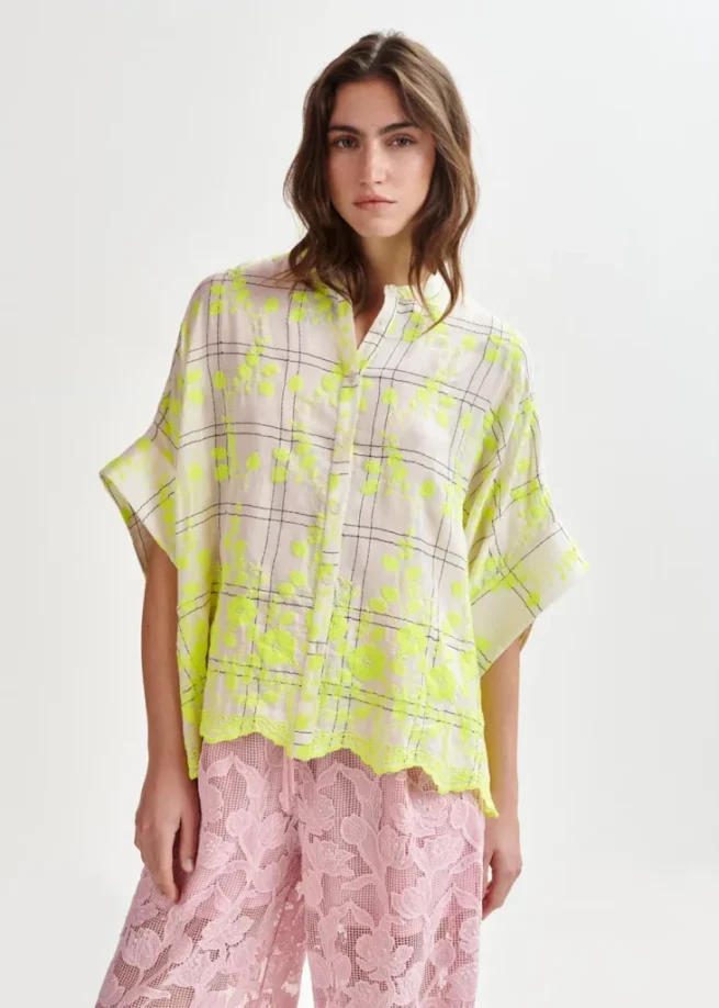 Luchtig overhemd met maokraag, wijde 3/4-mouwen en verfijnd ruitjesmotief. Het oversized boxy silhouet drapeert prachtig over jouw silhouet, zowel ingestopt als los gedragen. Het delicate bloemenborduurwerk en de zoom met festons en geborduurde details geven dit tijdloze basisstuk een vleugje elegantie.