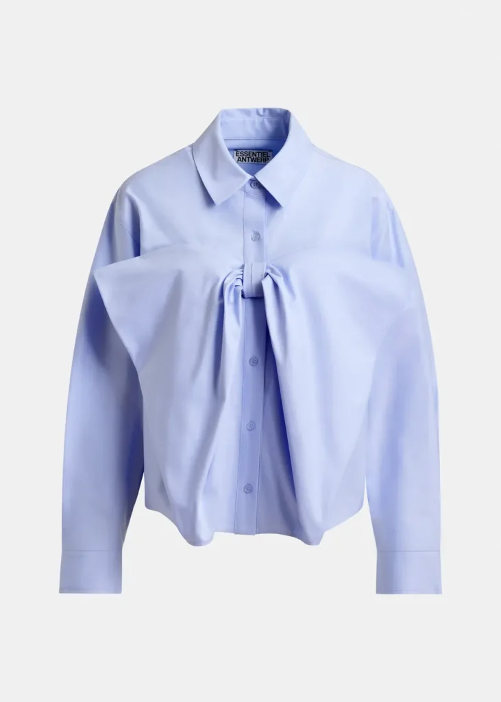 Overhemd van katoenmix, als gedurfde variant van de klassieker. Het is afgewerkt met een puntkraag en een knoopsluiting over de hele lengte. Het unieke kenmerk is de theatrale strik op de borst, die zorgt voor een vleugje speelse elegantie.
