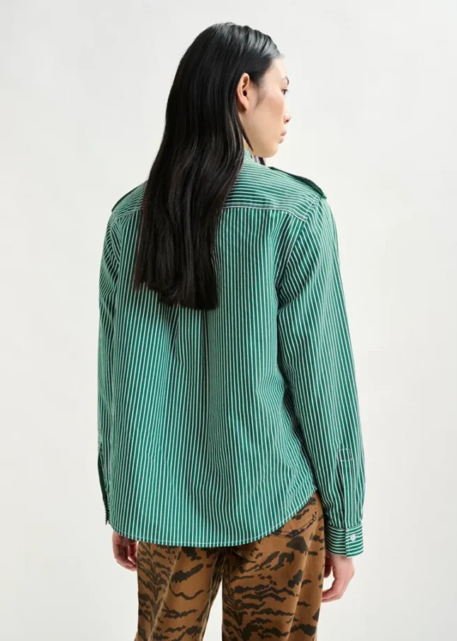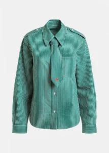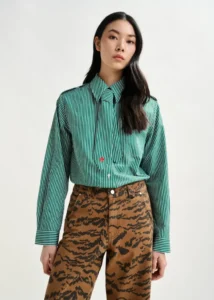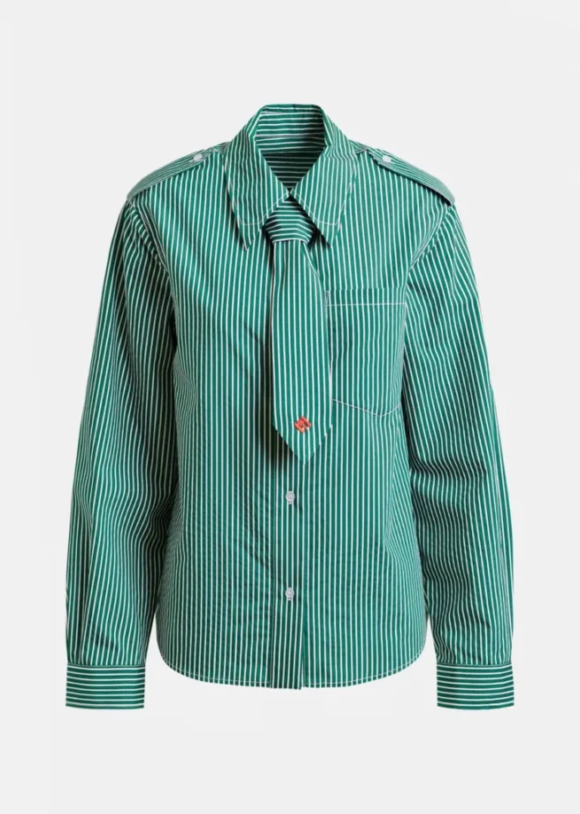 Boxy overhemd als speelse variant van het klassieke basisstuk. Het is vervaardigd van een katoenmix stof met lage mouwinzet en een licht afgeronde zoom. Het enkele borstzakje en knoopsluiting zorgen voor een tijdloos silhouet, terwijl de verwijderbare das een vleugje charme toevoegt. Schouderstukken met knoopdetail geven het een subtiel utilitair kantje, dat de relaxte maar verfijnde uitstraling versterkt. Perfect om ingestopt, los of gelaagd te dragen, want dit hemd combineert veelzijdigheid met verfijning.