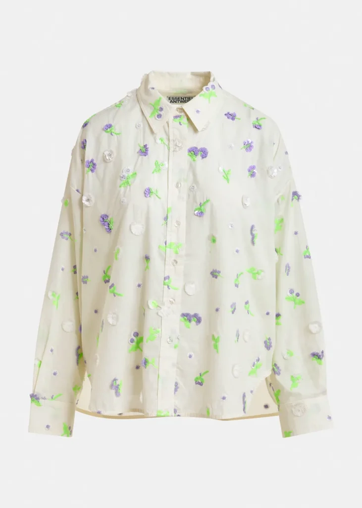 Voeg een elegante optie toe aan jouw garderobe met dit 100% katoenen overhemd, ontworpen in een relaxte pasvorm. Het is afgewerkt met een lage mouwinzet en een afgeronde zoom met langer achterpand. De knoopsluiting zorgt voor een klassieke uitstraling, terwijl de geborduurde bloemen van pailletten, stras en kralen het ontwerp naar een hoger niveau tillen met wat extra sprankel.