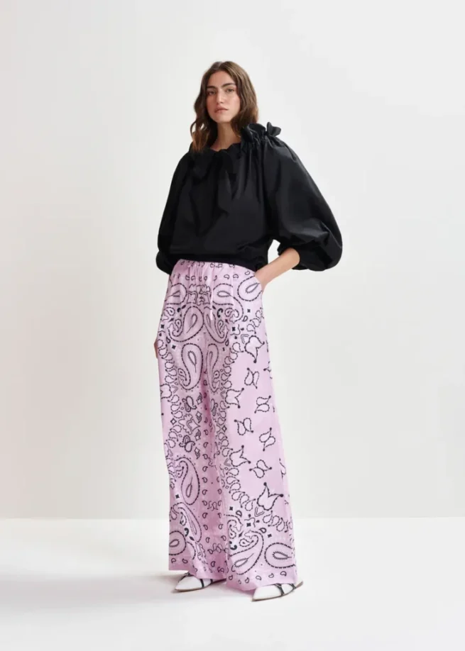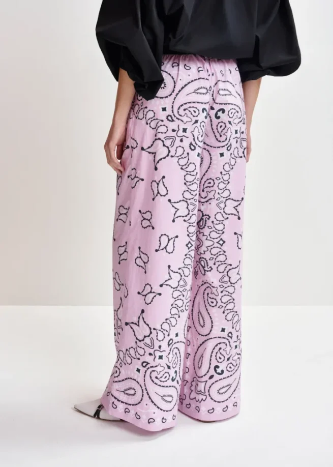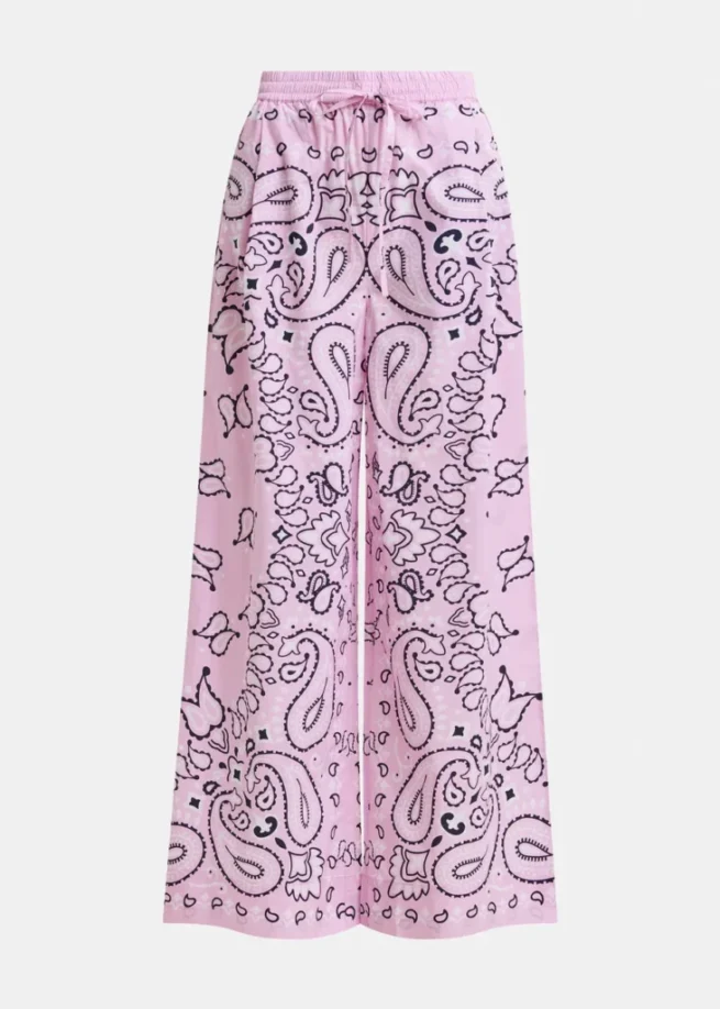 Broek vervaardigd van 100% katoen in een relaxte pasvorm met hoge taille en brede pijpen. De elastische tailleband met trekkoord garandeert je de perfecte pasvorm, terwijl de schuine steekzakken zorgen voor functionaliteit. De opvallende paisleyprint geeft hem een speels kantje, perfect voor casual uitjes of om te niksen in stijl.