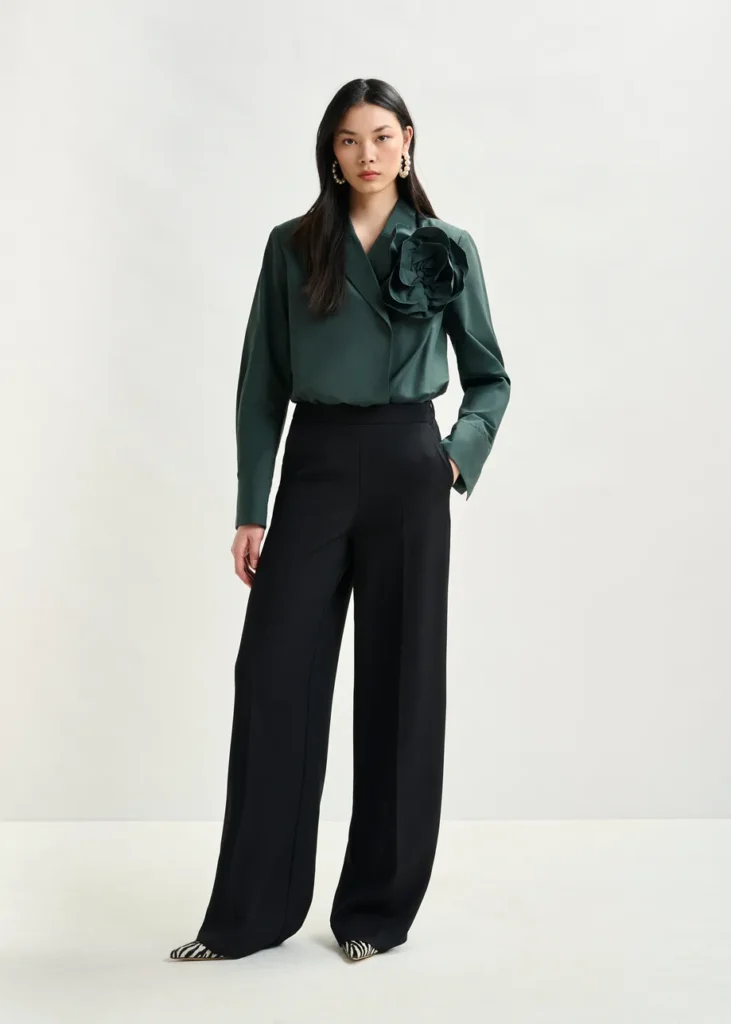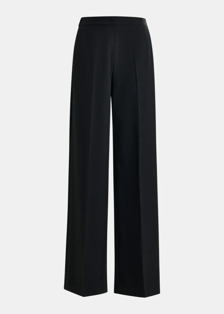Broek met hoge taille en brede pijp. De elastische tailleband biedt je comfort en flexibiliteit, terwijl de verborgen ritssluiting de voorkant sober houdt. De schuine steekzakken zijn praktisch en de paspelzakken achteraan zorgen voor een gestructureerde look. Een elegante persvouw vooraan en achteraan zorgt voor extra definitie en elegantie.