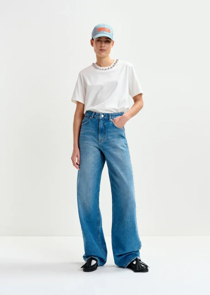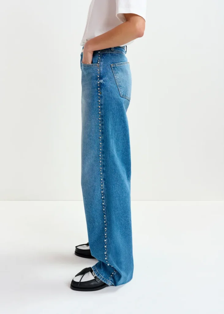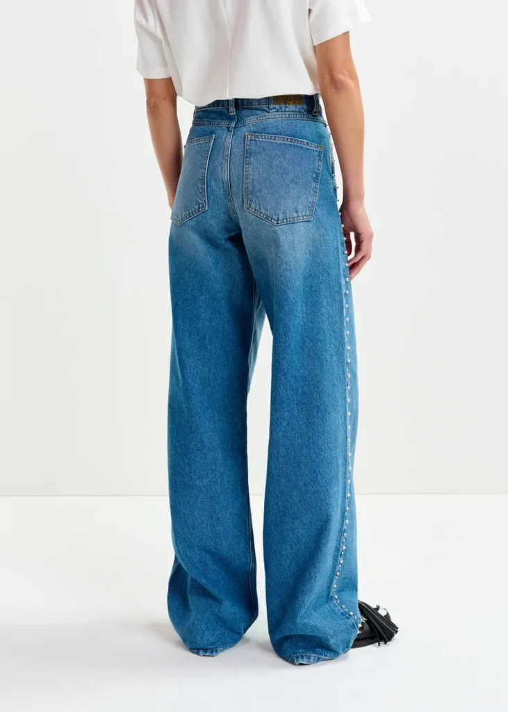 Deze jeans is gemaakt van een katoenmix in middelzware denim en heeft een hoge taille en een rechte pijp die subtiel uitloopt bij de zoom. Een klassieke five-pocketconstructie, riemlussen en een rits- en knoopsluiting bieden tijdloze structuur. Het ontwerp is op een ecologisch verantwoorde manier geproduceerd en is afgewerkt met parel- en stud-versieringen die een tactiel randje geven aan dit alledaagse silhouet.