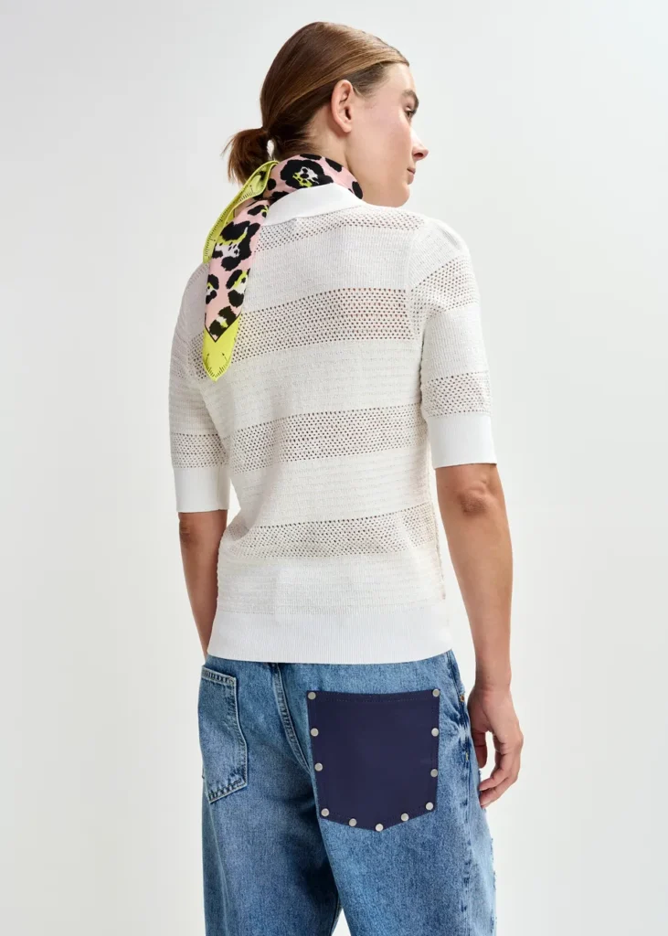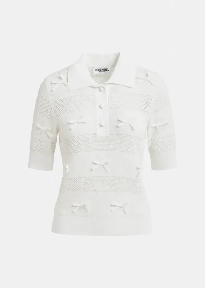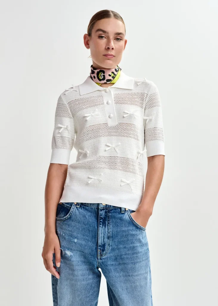 Charmante gebreide polo vervaardigd van fijne gerecyclede polyester. Hij is voorzien van een relaxte pasvorm met bijpassende knoopsluiting en geribbelde boorden voor een verzorgde look. De 3/4-mouwen en subtiele strikversieringen voegen een vrouwelijk tintje toe, perfect voor layering of om alleen te dragen.
