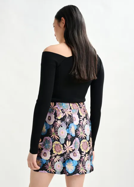Minirok vervaardigd van gestructureerd bloemenjacquard en ontworpen in een aansluitende pasvorm met subtiel A-lijn silhouet. De stof is versierd met pailletten en kralen die het weefpatroon extra textuur en dimensie geven. De verborgen ritssluiting achteraan zorgt voor een nette afwerking, terwijl de discrete split achteraan jou bewegingsvrijheid garandeert. De rok is ook volledig gevoerd voor jouw comfort.