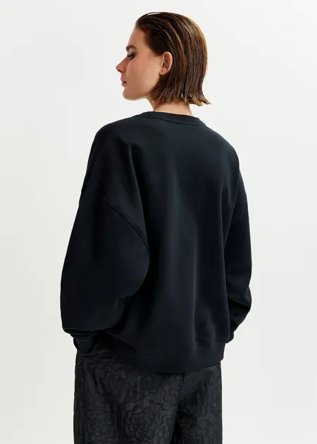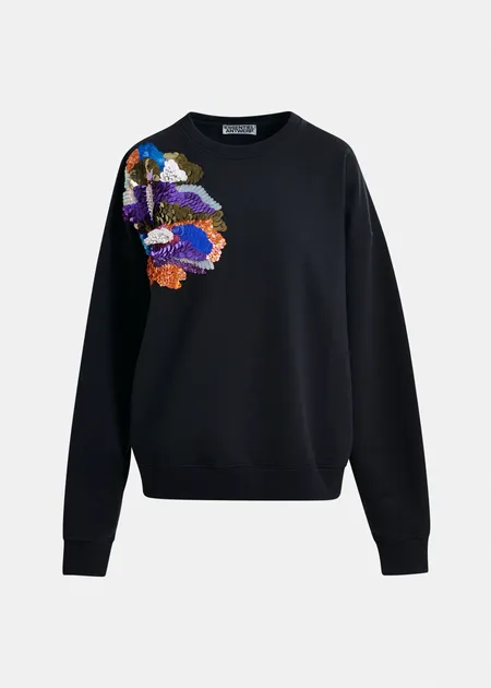 Sweater van zacht katoenen jersey, ontworpen in een relaxte pasvorm en afgewerkt met dubbele stiksels. Met zijn verfijnd bloemenborduurwerk van kralen en pailletten op de schouder, geeft hij zelfs jouw meest casual dagen een vleugje sprankel.
