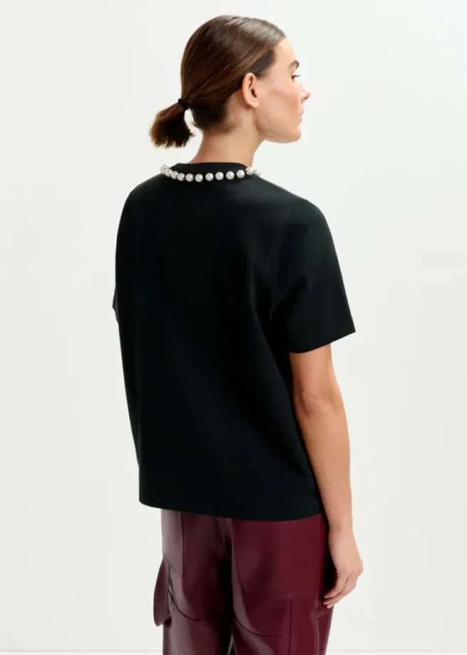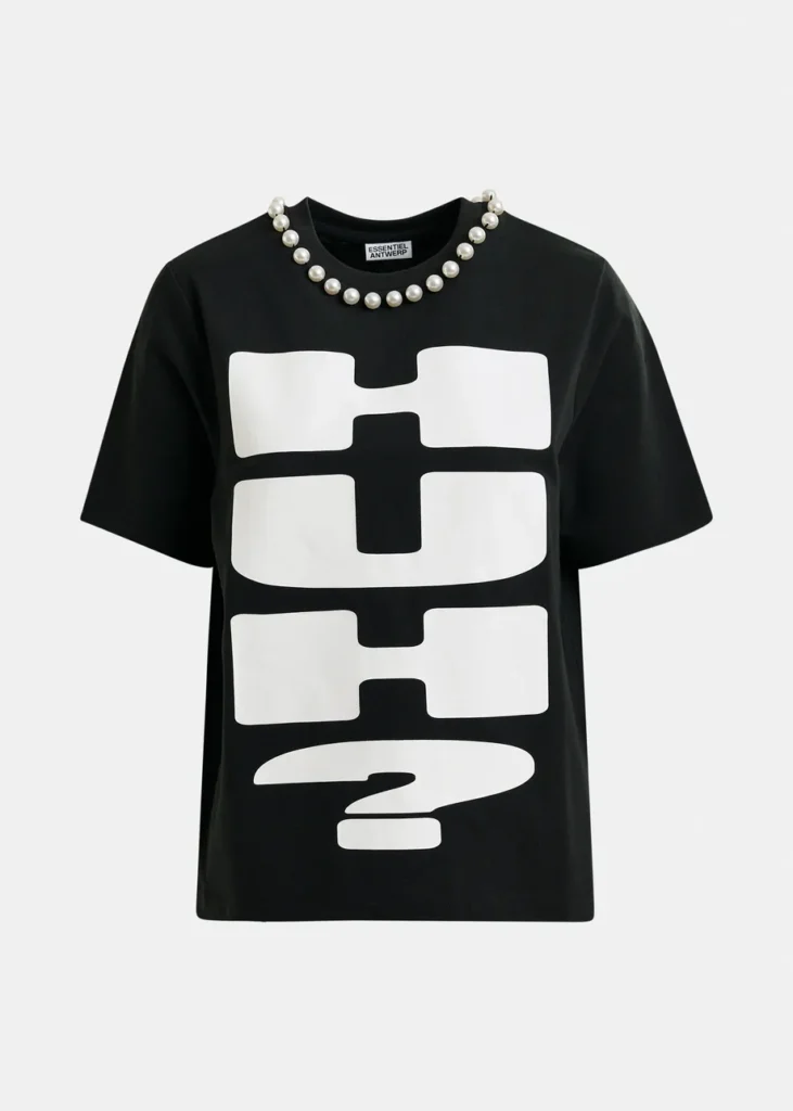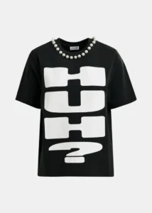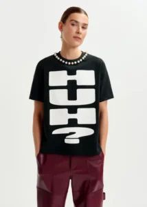 Relaxed T-shirt vervaardigd van 100% katoen. De verticaal geprinte “HUH?” op de voorzijde zorgt voor een brutaal kantje, terwijl de kralen aan de halslijn een vleugje sprankel toevoegen. Perfect voor een uitje in de stad of onder een jas, als statement item met een nonchalante uitstraling.
