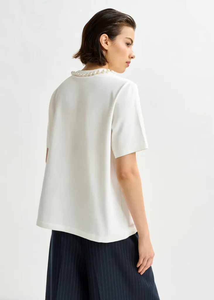 Relaxed T-shirt vervaardigd van 100% katoen. De verticaal geprinte “HUH?” op de voorzijde zorgt voor een brutaal kantje, terwijl de kralen aan de halslijn een vleugje sprankel toevoegen. Perfect voor een uitje in de stad of onder een jas, als statement item met een nonchalante uitstraling.