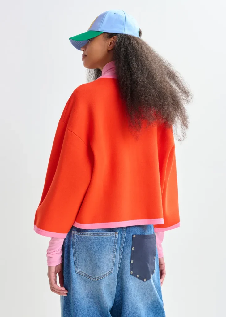 Boxy cardigan met lage mouwinzet en relaxed silhouet. Hij is voorzien van een ritssluiting aan de voorkant, opgestikte zakken en contrasterende randen. De dubbele stiksels accentueren het ontwerp en geven het extra definitie.