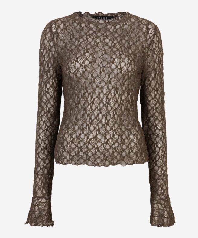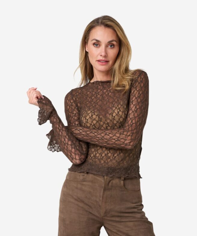 De Taola top in Coffee Bean is een transparante top met ronde hals en speelse trompetmouwen. De aansluitende fit en stretch nylonmix maken het item comfortabel en stijlvol.