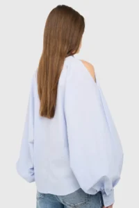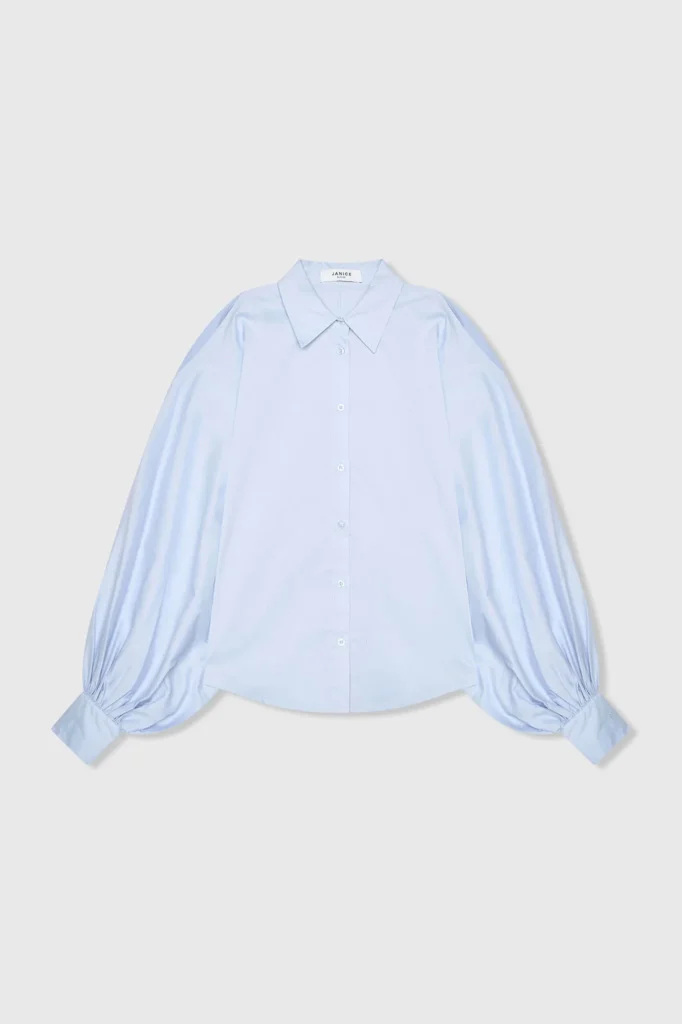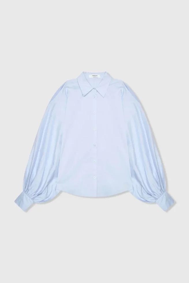 De blouse dames katoen blauw tone pofmouw cut out van JANICE is een moderne, luxe dames blouse die direct opvalt door de vrouwelijke details en de rijke uitstraling. Deze elegante blouse is gemaakt van een hoogwaardige katoenmix die comfortabel aanvoelt en door de toevoeging van nylon en spandex een mooie structuur en subtiele flexibiliteit heeft. De blouse heeft een kraag en een klassieke knoopsluiting, uitgevoerd in een tijdloze blauwe kleur die eenvoudig te combineren is. De raglan mouwen lopen over in een royale pof, wat zorgt voor extra volume en een verfijnde silhouetlijn. De hogere manchetten sluiten mooi aan en geven het geheel een elegante afwerking die past binnen het gevoel van silent luxury.