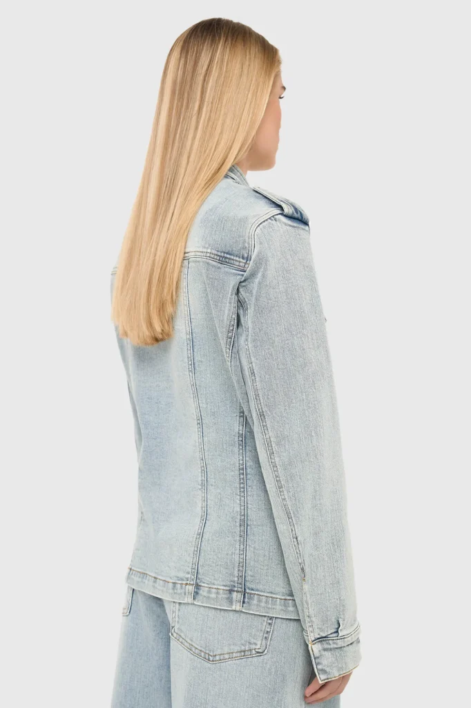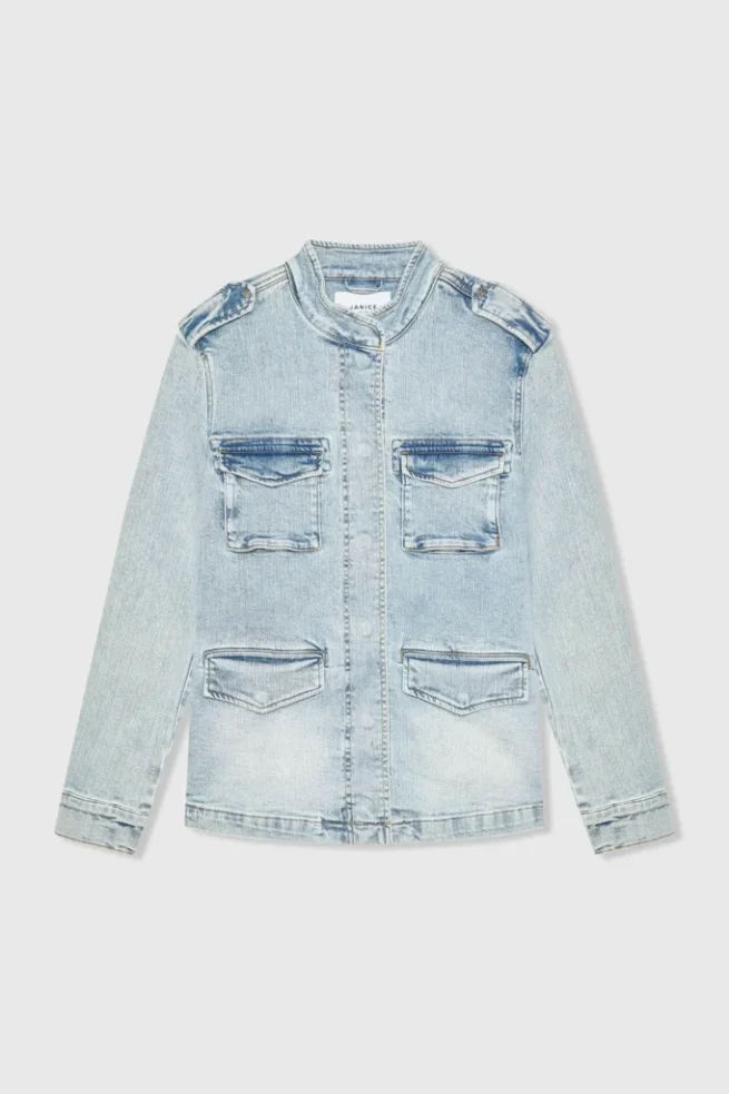 Deze spijkerjas, de DWAYNE blauw 565, van JANICE is gemaakt van een stretch denim kwaliteit en een stijlvolle toevoeging aan de garderobe van iedere vrouw die houdt van een moderne, luxe dames jas met een tijdloze uitstraling. Dit jack is uitgevoerd in een hoogwaardige denim kwaliteit met 94% katoen, 5% polyester en 1% spandex, waardoor het zacht aanvoelt en dankzij de stretch prettig meebeweegt. De aangesloten fit en de opstaande boord geven dit blauwe denim jack een eigentijdse, vrouwelijke look die perfect past binnen de verfijnde signatuur van JANICE.