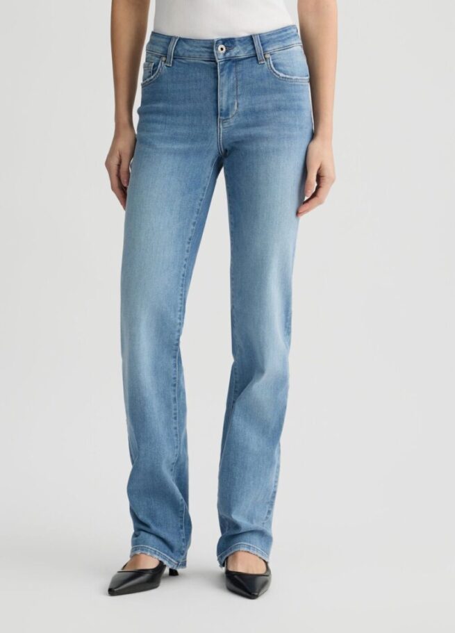 Blauwe straight-leg jeans. De jeans is low-waisted.