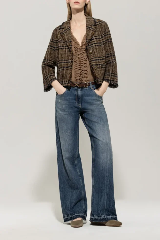 Een kort, boxy blazerjasje van luxueuze chenillewol met een ruitjesmotief en een volledig onafgewerkte afwerking. Grote metalen knopen in een vintage design en twee opgestikte zakken maken de vrouwelijke look compleet.