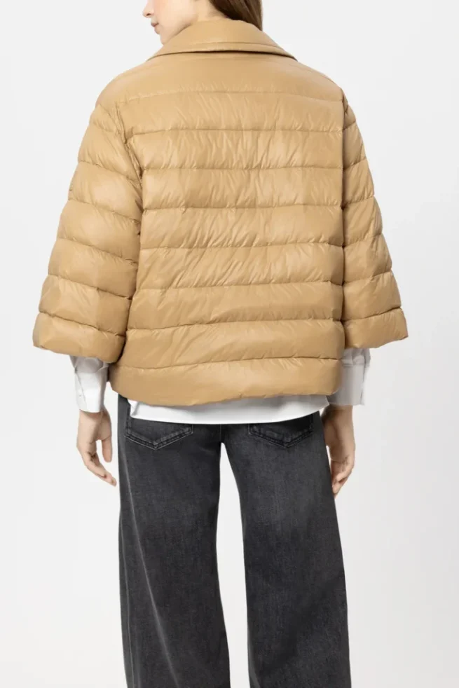 Gewatteerde donsjas van lichtgewicht outdoor nylon in een casual cape-model met reverskraag en wijde, korte mouwen. De jas heeft een drukknoopsluiting aan de voorkant, twee zijsplitten met drukknopen, een verstelbaar trekkoord in de zoom, twee open zijzakken en een binnenzak.