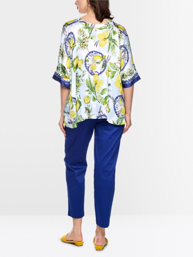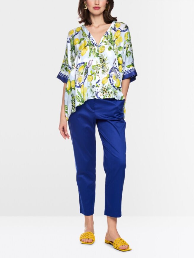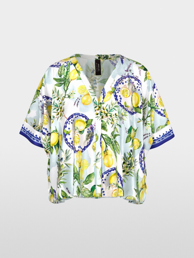 Wijd gesneden blouse van pure, soepel vallende viscose met een aangenaam lichte val. De mediterrane print met citroenen en olijven maakt deze blouse tot een absolute blikvanger en geeft hem een zomerse flair. Driekwartmouwen, V-hals en doorlopende knoopsluiting met sierknopen onderstrepen de vrouwelijke look.