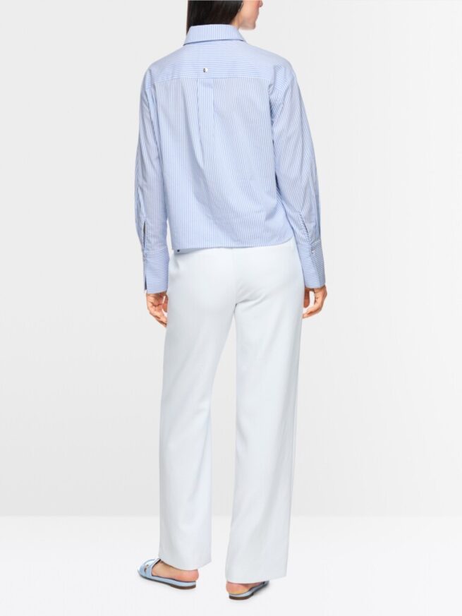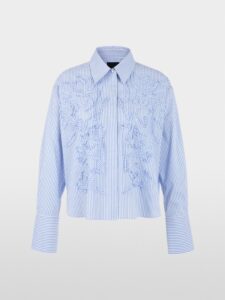De blouse met lengtestrepen heeft een klassieke overhemdkraag en een verborgen knoopsluiting – modern, casual en veelzijdig te combineren. De oversized schouders en brede manchetten geven het ontwerp een elegante nonchalance. Bijzonder opvallend zijn de gestikte banden in een bloemmotief, die de look een vrouwelijke en individuele touch geven. Een stijlvol statement piece voor vele gelegenheden.