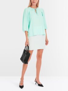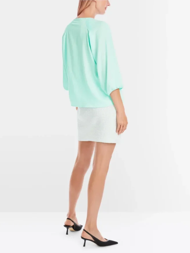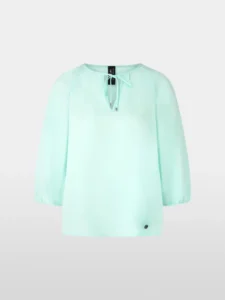 Wijde, zacht vloeiende blouse van voornamelijk gerecycled polyester. De vorm is gebaseerd op een slim geconstrueerde raglan. De halslijn heeft een ronde hals, split en lintsluiting. Het model is verantwoord geproduceerd en draagt het duurzaamheidslabel “Rethink Together”.