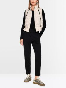 Gewatteerd vest met golvende stiksels en bijzondere naden. De losse snit geeft het vest een moderne touch. Dit wordt ook benadrukt door de elastische tailleband en de daarop aangebrachte volantrij. De gewatteerde opstaande kraag zorgt voor warmte op koelere dagen. Zijzakken maken de look compleet. Het vest wordt gesloten met een ritssluiting.