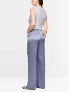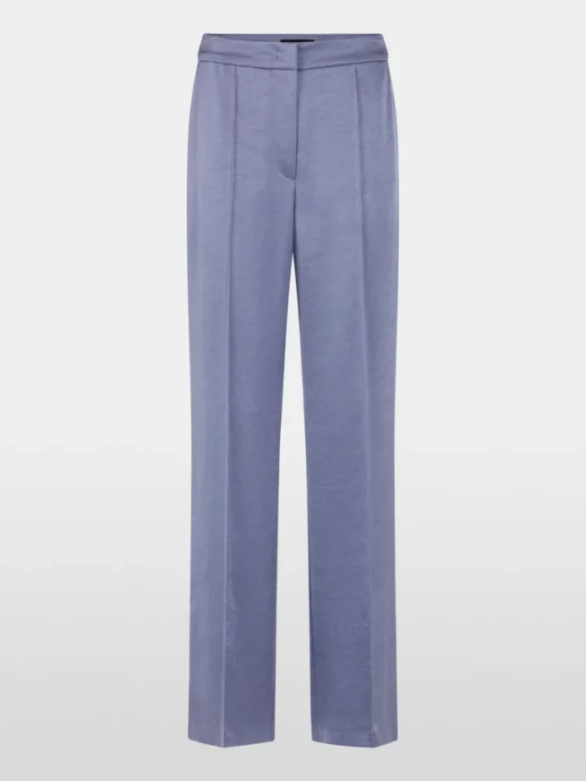 De broek WUKARI heeft een chique glanzende uitstraling dankzij het gehamerde satijn en de gestikte persvouwen. Hij heeft een comfortabele wijde pasvorm met lange pijpen. De broek wordt gesloten met een ritssluiting en haak.