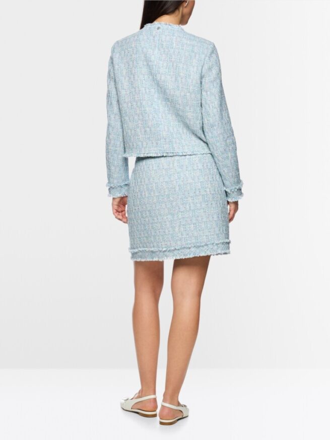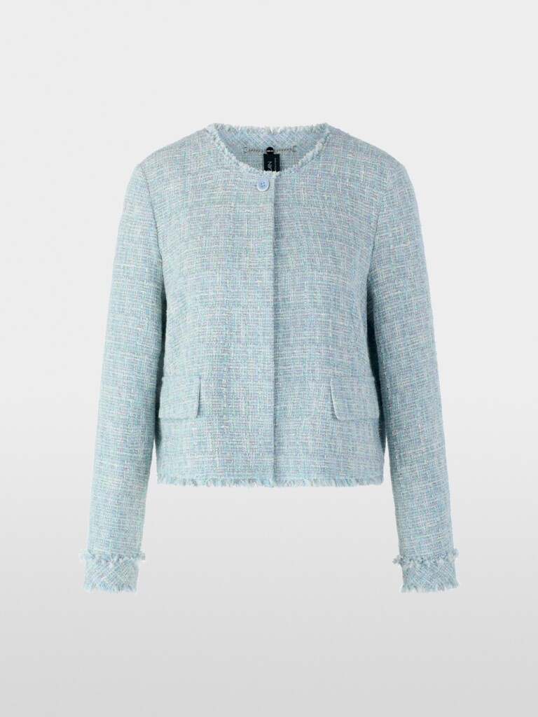 Het jasje van bouclé heeft een grove, gestructureerde weefstructuur en een subtiele kleurenmix. De verborgen ritssluiting zorgt voor een strakke, elegante lijn. Franjes aan de kraag en zomen zorgen voor moderne accenten. Een vrouwelijk jasje met een lichte structuur en een zachte look.
