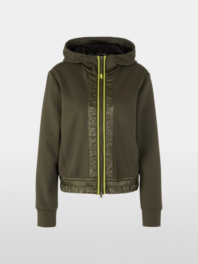 Jasje van licht, rekbaar materiaal. Het model is redelijk wijd en sportief, met een capuchon met meshvoering. In contrast hiermee: lichte ruches aan de zoom. Cool, de kleurverdeling: streepjesdetail op de ritssluiting aan de voorkant, dat doorloopt op de achterkant. Daarnaast zijn er aan de voorkant nog elementen in glanzend materiaal met stiksels.
