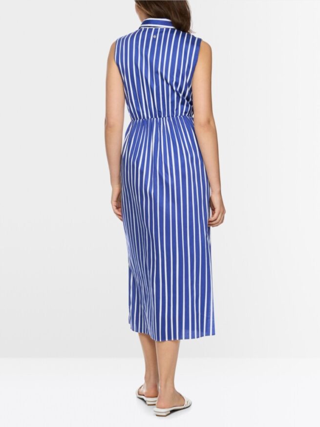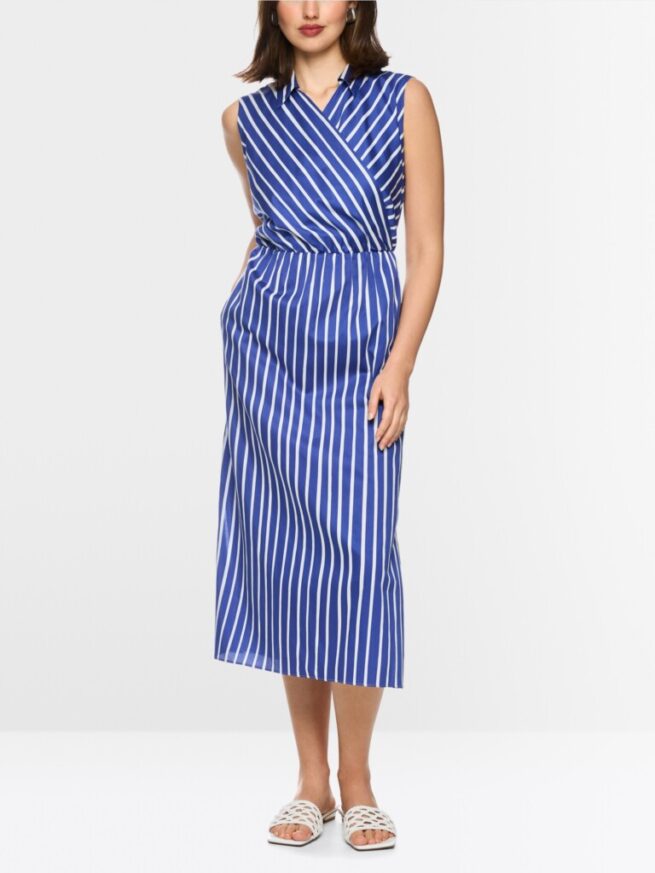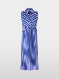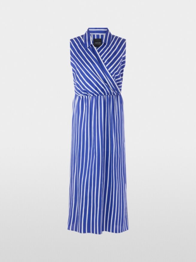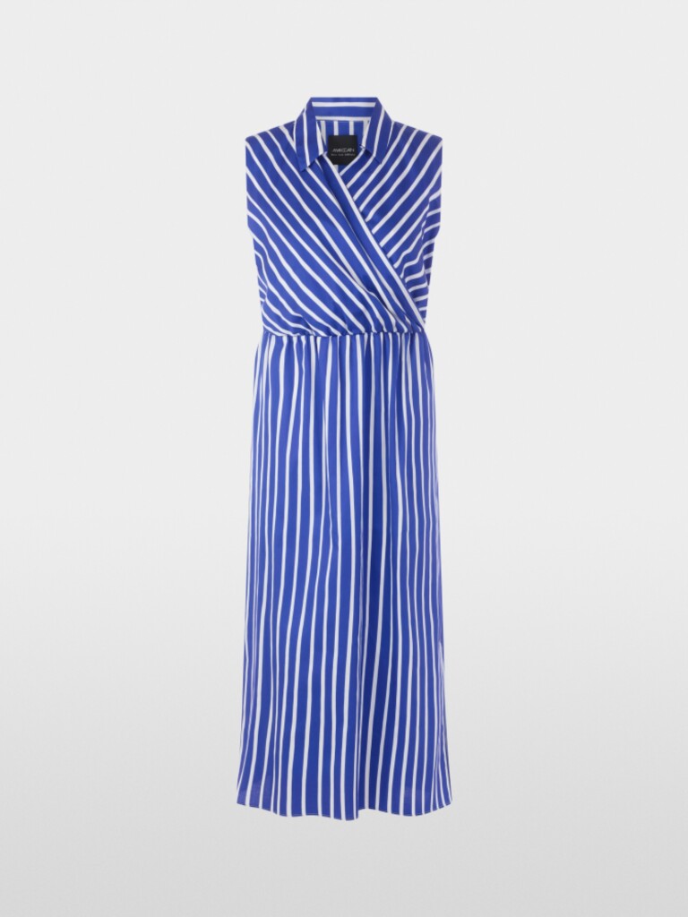 De kuitlange katoenen jurk met streepmotief combineert functionaliteit met een vrouwelijk design. Het mouwloze bovenstuk met gekruiste look en V-hals gaat over in een taille met smalle elastische band, die het iets uitlopende rokdeel accentueert. Een split aan de zijkant en praktische steekzakken maken de look compleet. Een korte ritssluiting aan de zijkant zorgt ervoor dat je de jurk gemakkelijk aan kunt trekken.