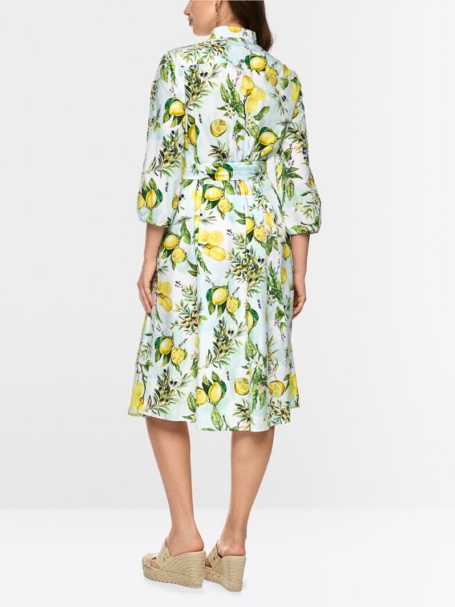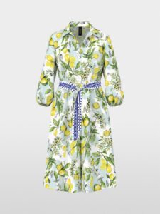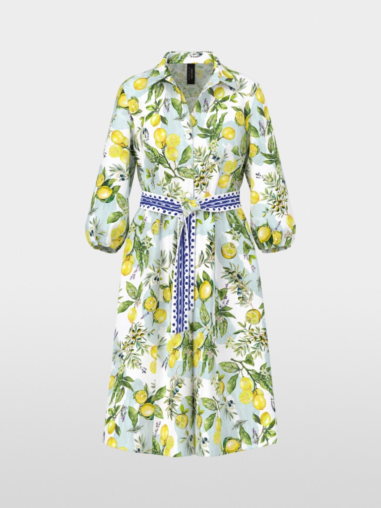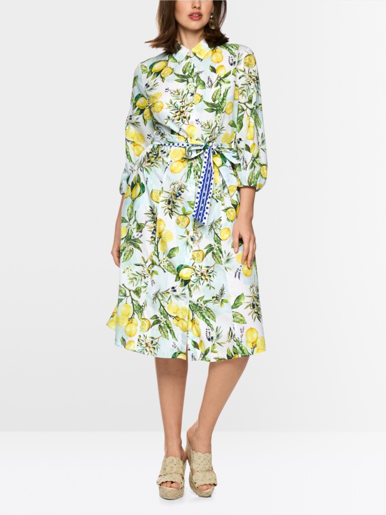 De katoenen midi-jurk valt op door een zomerse print met citroenen en olijven. De zwierige rok en de doorlopende knoopsluiting geven het ontwerp een klassieke elegantie. Driekwartmouwen met fijne plooitjes aan de uiteinden en een bijpassende strikceintuur om de taille te accentueren zorgen voor vrouwelijke accenten. Praktische steekzakken maken de look functioneel af.