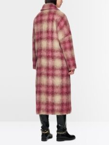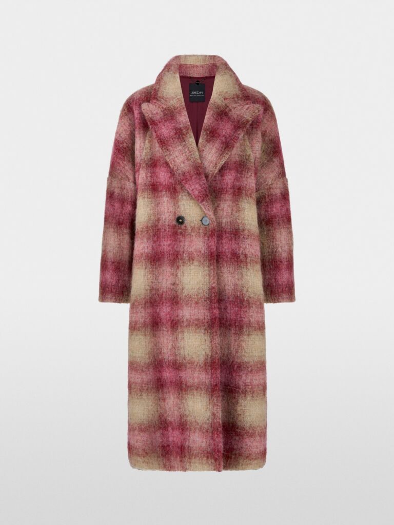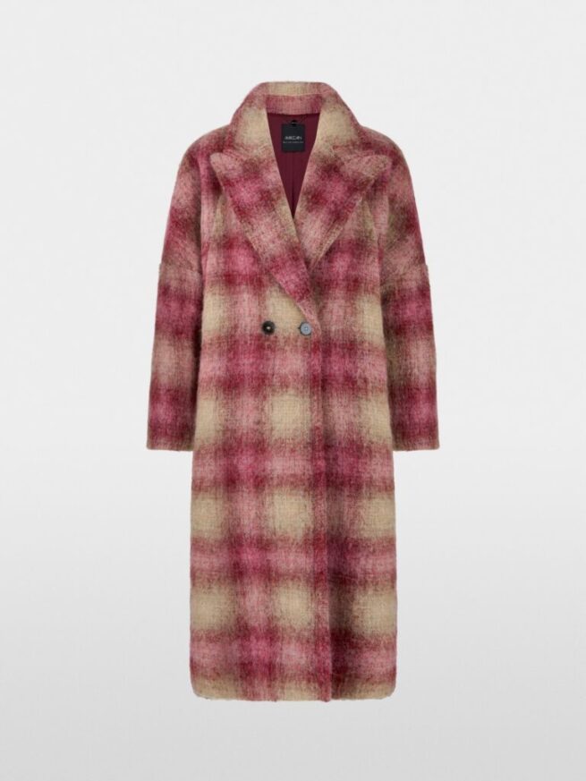 Lange jas met elegant, vloeiend ruitpatroon in bordeauxrood en beige, met subtiele roze accenten. De reverskraag en de twee knopen geven hem een klassieke elegantie. De jas heeft een gestructureerd oppervlak en een moderne oversized pasvorm. Deze jas is perfect voor koude dagen en een echt statement-model.