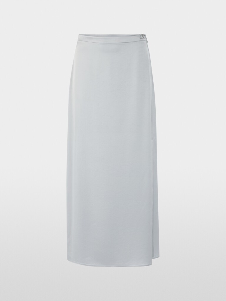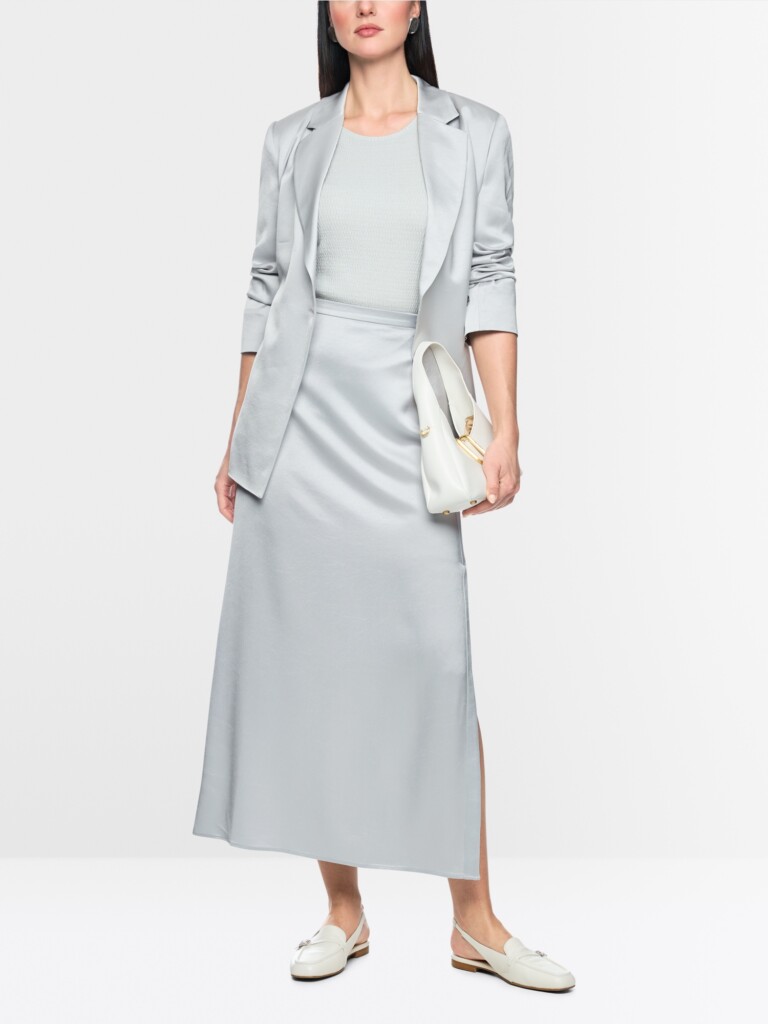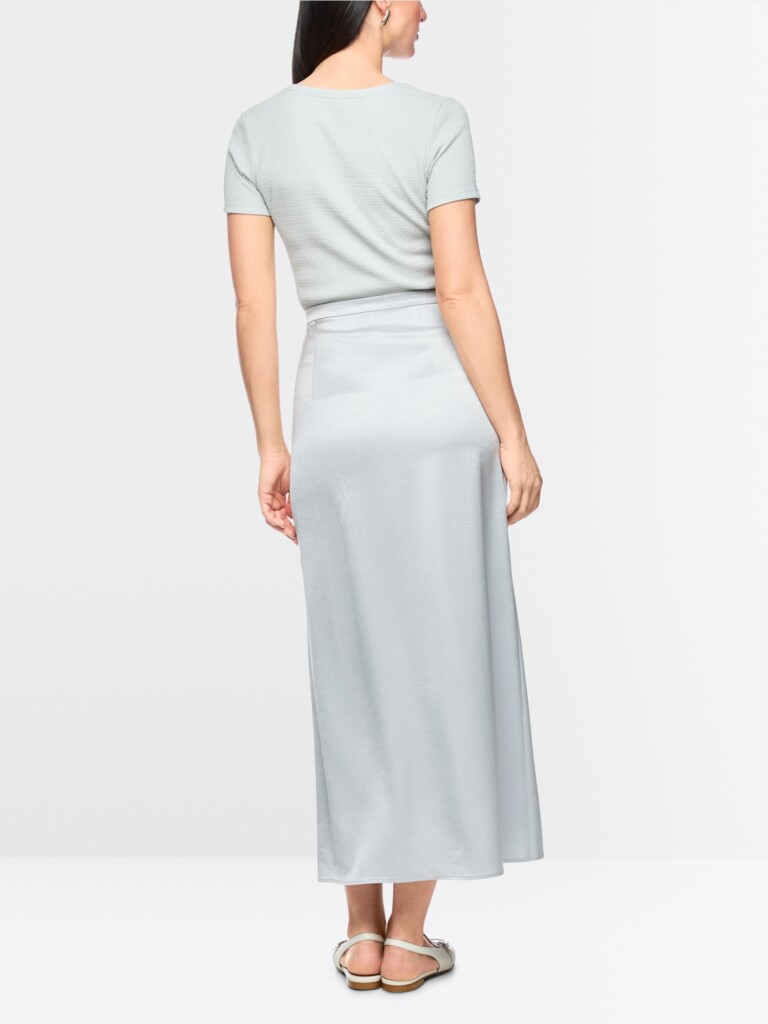 De midirok van een acetaat-polyestermengsel heeft een elegante val met een zijdezachte glans. Hij is comfortabel om te dragen en bovendien onderhoudsvriendelijk. De zijsplit zorgt voor bewegingsvrijheid, een fijn sierdetail aan de tailleband zorgt voor een subtiel accent. De rok wordt gesloten met een onopvallende ritssluiting aan de zijkant. Ideaal om te combineren met blouses en gebreide tops.