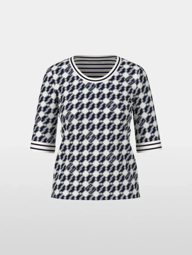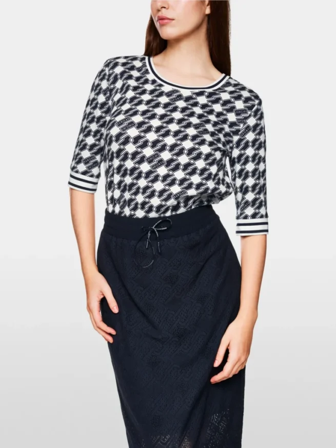 Het T-shirt in het nieuwe kubusdesign is een eyecatcher op zich. Gestreepte biezen accentueren de stijl. Door de comfortabele materiaalmix van katoen en elastaan biedt het jersey shirt maximaal draagcomfort. Een ronde hals en driekwartmouwen maken het geheel af.