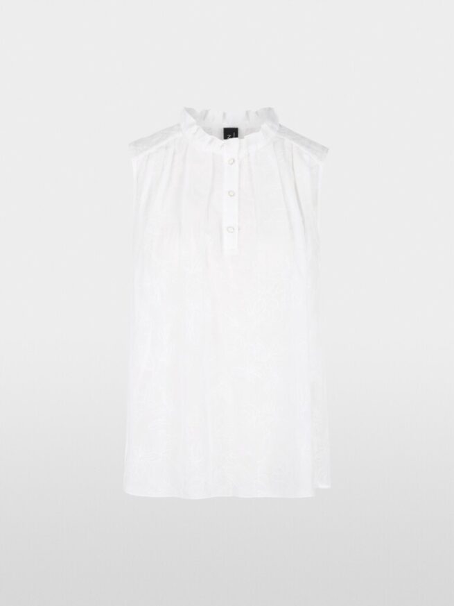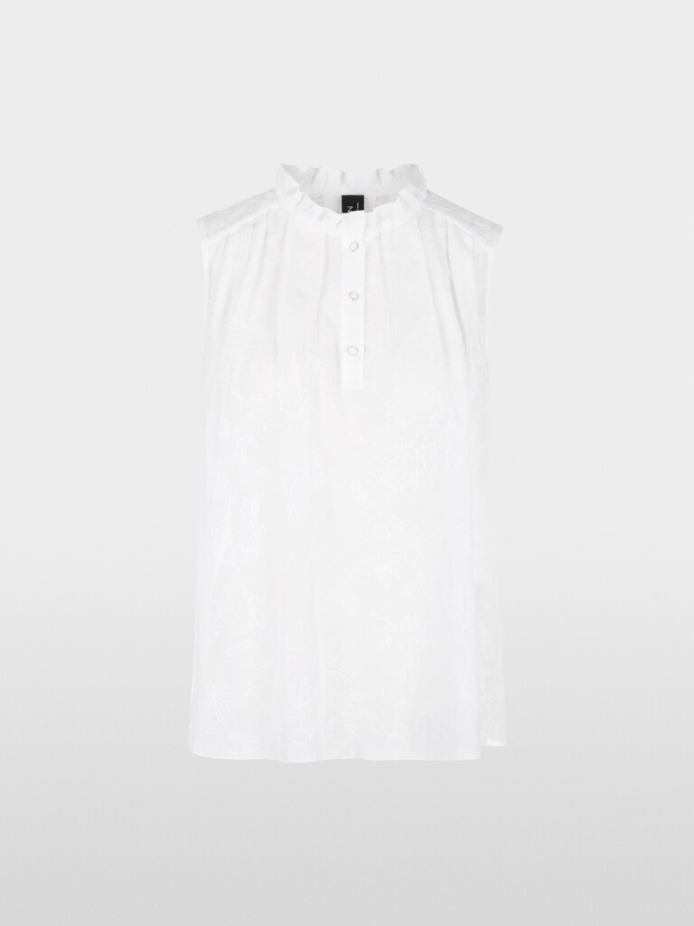 De elegante top van halfdoorzichtige stof is gemaakt van een katoen-zijdemix. De fijne ruches aan de kraag en de subtiele knoopsluiting zorgen voor vrouwelijke accenten. Versierd met filigrane bloemenborduursels is de top ideaal voor lichte laagjeslooks of als elegant solostuk.