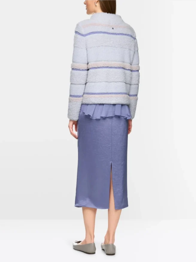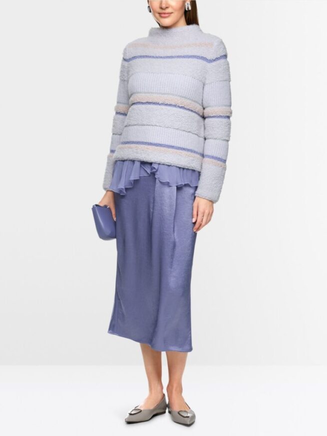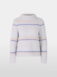 Het model van verschillende effectgarens in een streepmotief is recht gesneden en heeft een opstaande kraag.