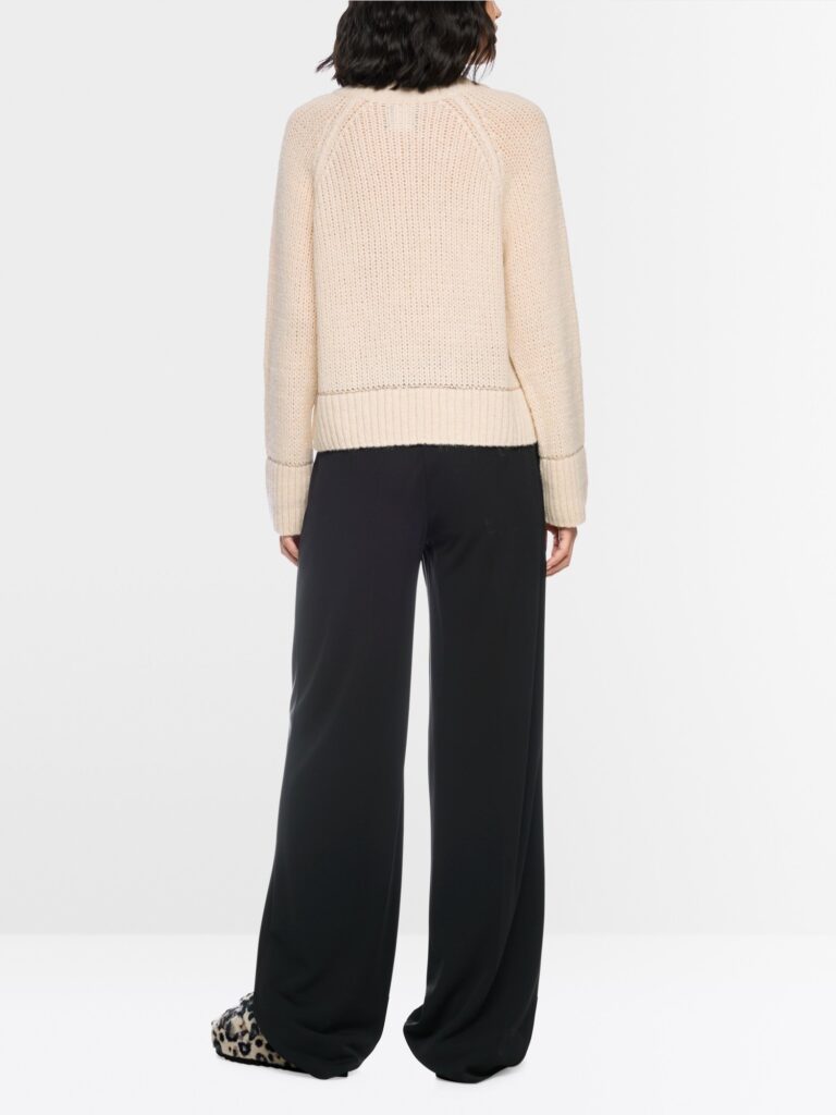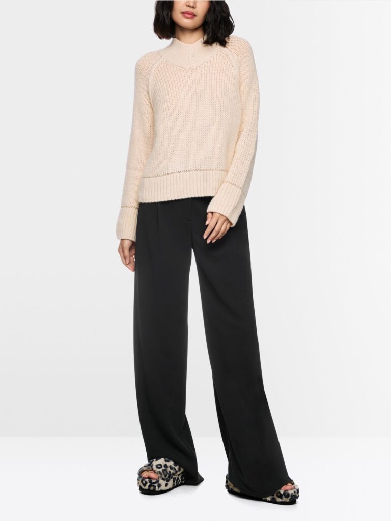 De grof gebreide trui heeft een losse snit, wat zorgt voor een casual, stijlvolle pasvorm. Hij heeft een hoge kraag met een lichte V-hals en subtiele glitterdetails op de boorden van de mouwen en de ribgebreide zoom. De raglanmouwen geven hem een bijzondere look.