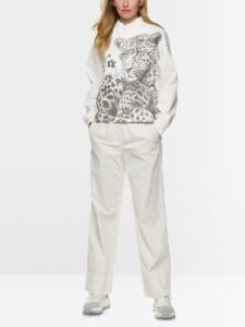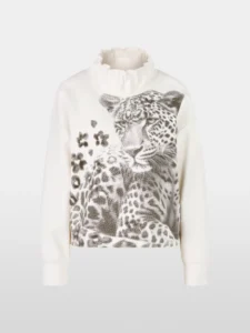 De trui is gemaakt van dikke jersey met een stoere luipaardprint en bloemendetails in zeefdruklook. Hij heeft een verlaagde schoudernaad en een rechte pasvorm voor een casual look. De halslijn is verhoogd en heeft een elastische band die iets is aangerimpeld. De lange mouwen eindigen in een boord.