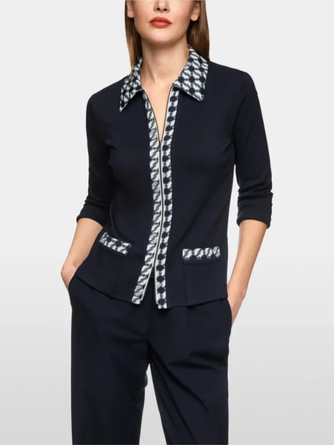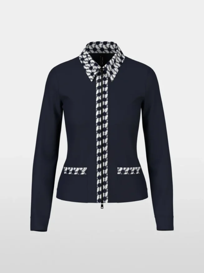 Smal gesneden jasje van comfortabele stretchjersey voor optimaal draagcomfort. Kleine details met kubusprint geven het jasje een bijzondere uitstraling. Opgestikte zakken en de tweewegritssluiting onderstrepen de look.