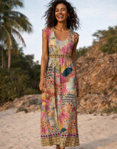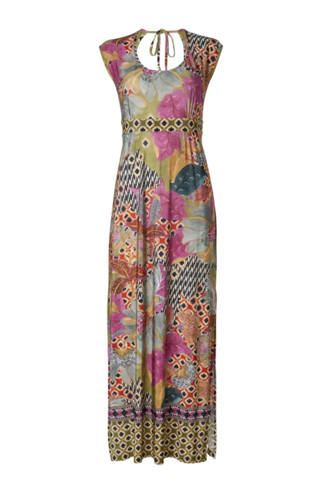 De Rony Primavera Jurk is een mouwloze lange jurk gemaakt van een zachte stof. De jurk heeft een mooie ronde hals, een split aan de zijkant, een tailleband voor een flatterend silhouet. Een extra detail is de striksluiting in de nek.