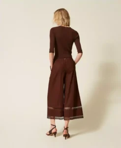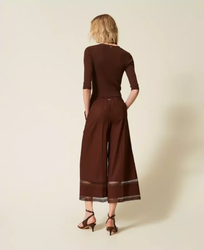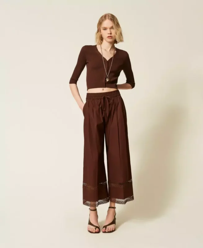 Stretch katoenen poplin broek met geborduurde inzetstukken en afwerking. Elastische tailleband met trekkoord, zijzakken en losse pasvorm.