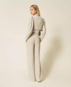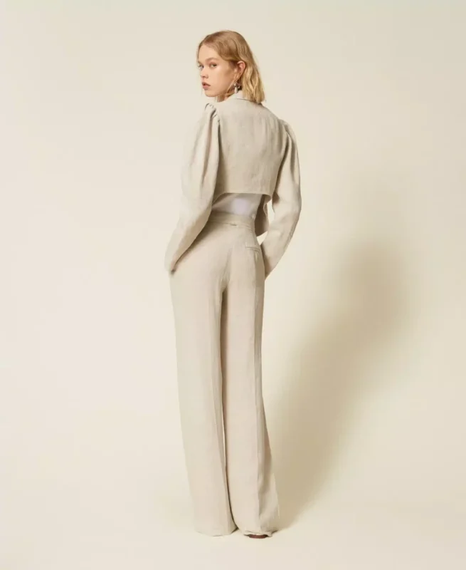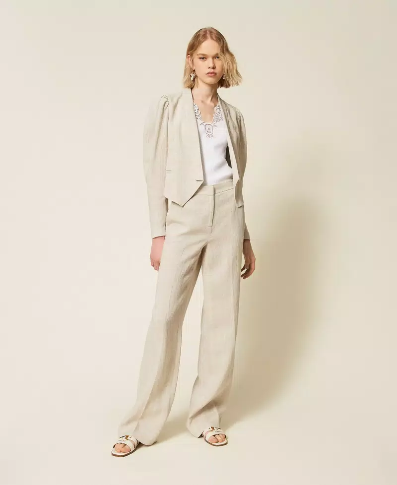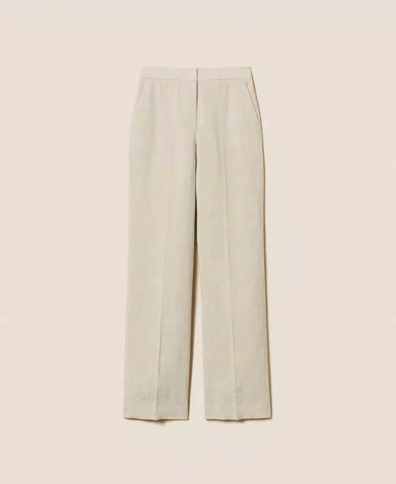 Broek gemaakt in Italië van natuurlijk linnen met lurex voor een zacht, licht effect. Stevige ritssluiting en haaksluiting, schuine zakken aan de zijkanten en paspelzakken aan de achterkant, gestreken vouw en wijde pasvorm.