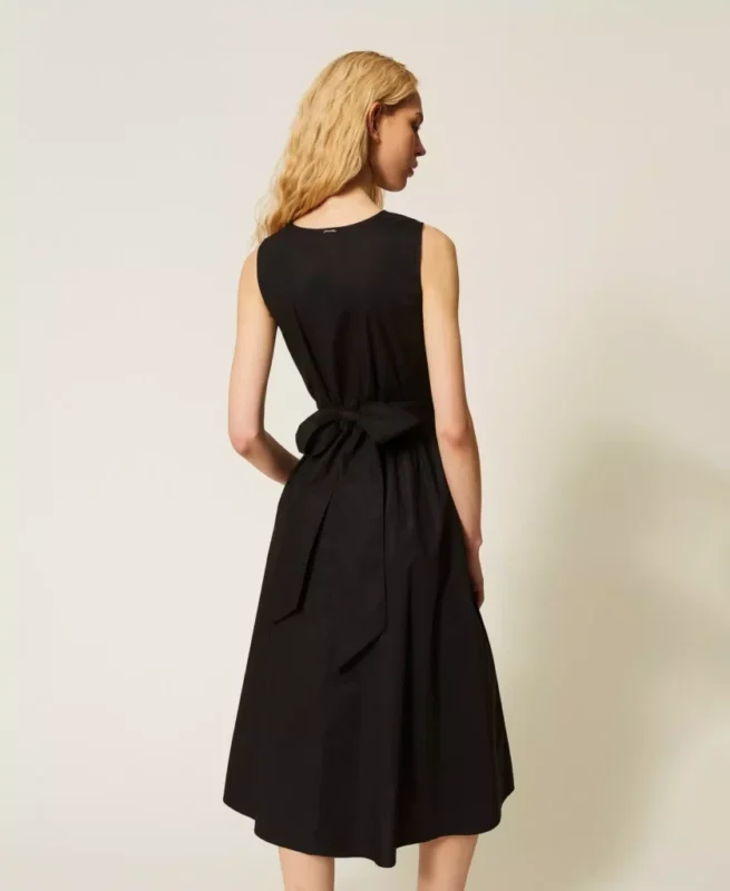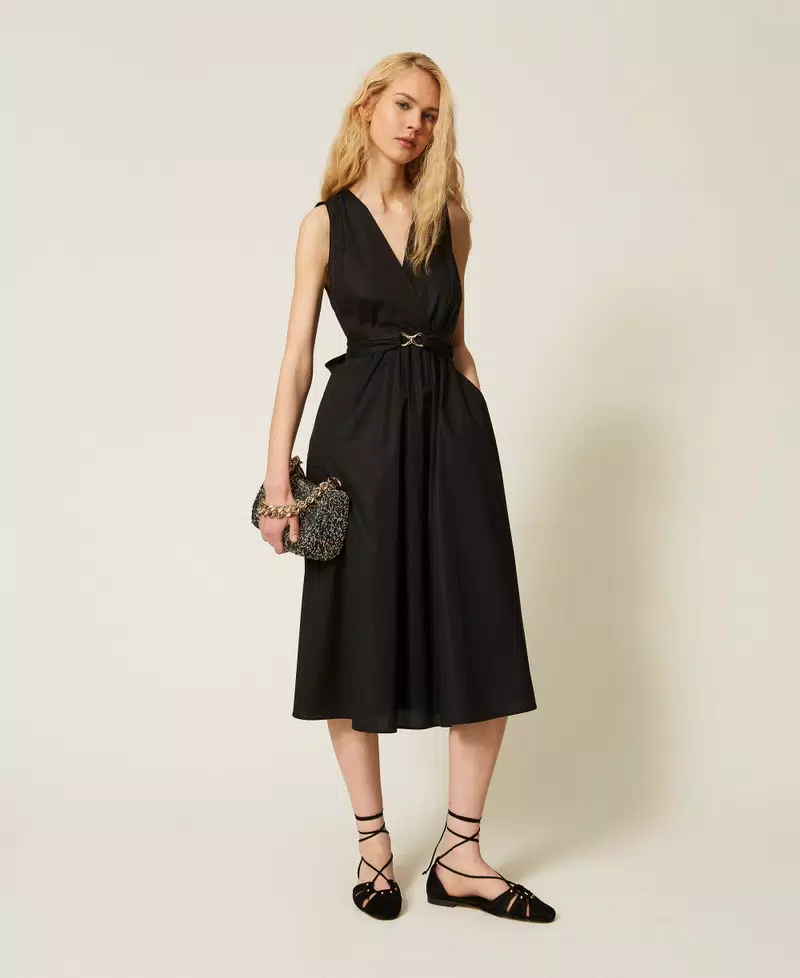 Midi-jurk van stretchkatoenpoplin met afneembare riem en logogesp. Overlappende V-hals, geplooide taille, ritssluiting en losse pasvorm.