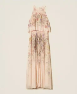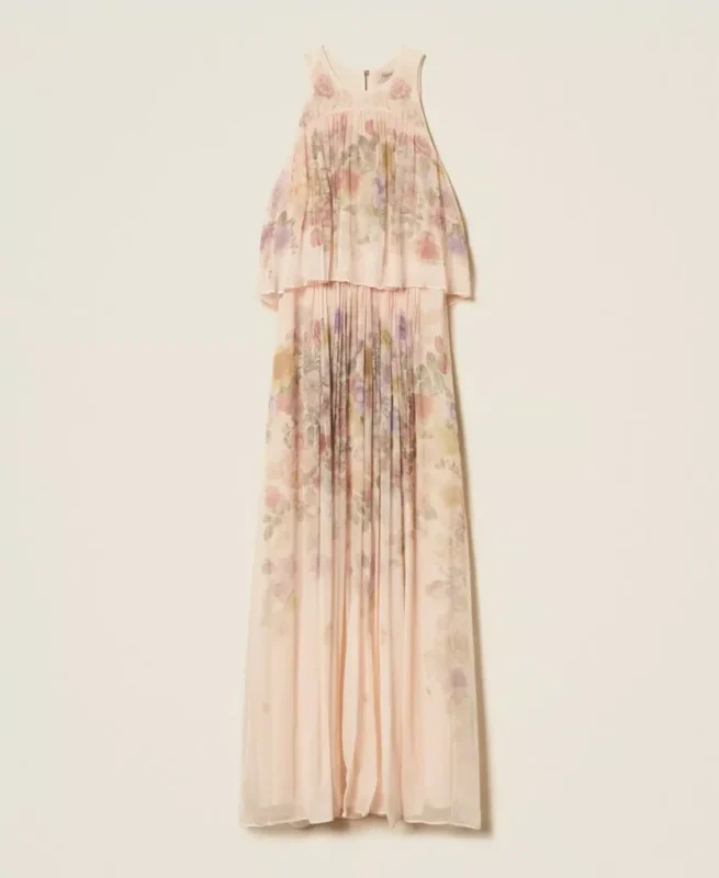 Lange jurk van viscosecrêpon met een vervagende bloemenprint, exclusief voor Twinset. Ronde hals, trompe-l'oeil lijfje met ruches, geplooide rok, bedekte knoopsluiting aan de achterkant en losse pasvorm.