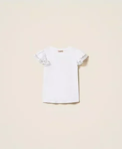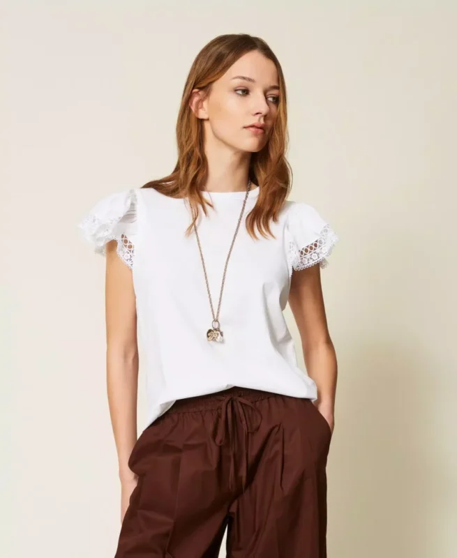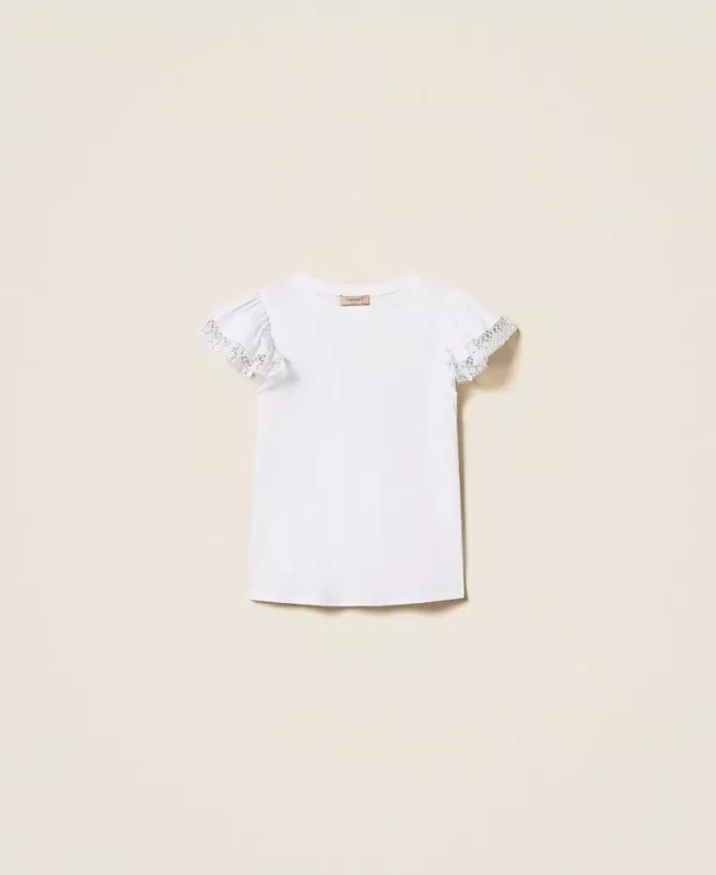 T-shirt van puur katoenen jersey met korte, geplooide mouwen met kanten afwerking, ronde hals en normale pasvorm.