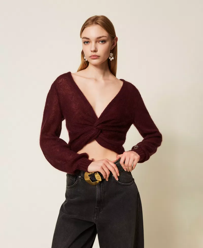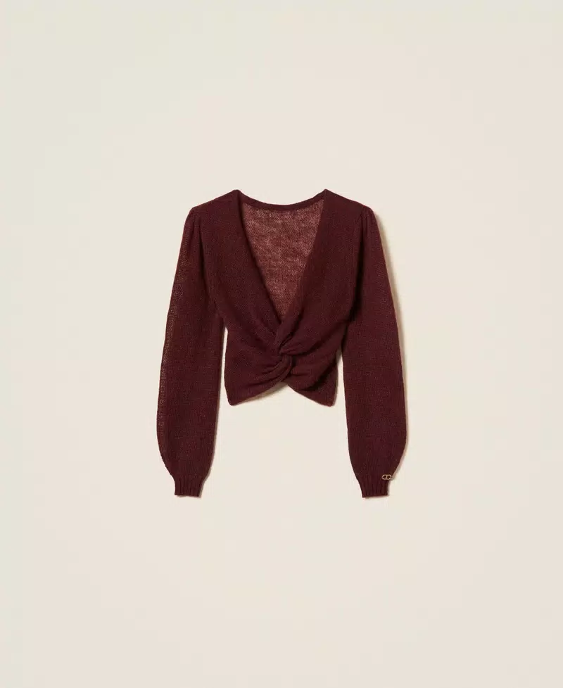 Bolero van een mohairmix die aan beide kanten draagbaar is, met een V-hals en een gekruiste hals aan de ene kant en een ronde hals aan de andere kant. Lange pofmouwen, een ovaal T-logoplaatje op de pols en een losse pasvorm.